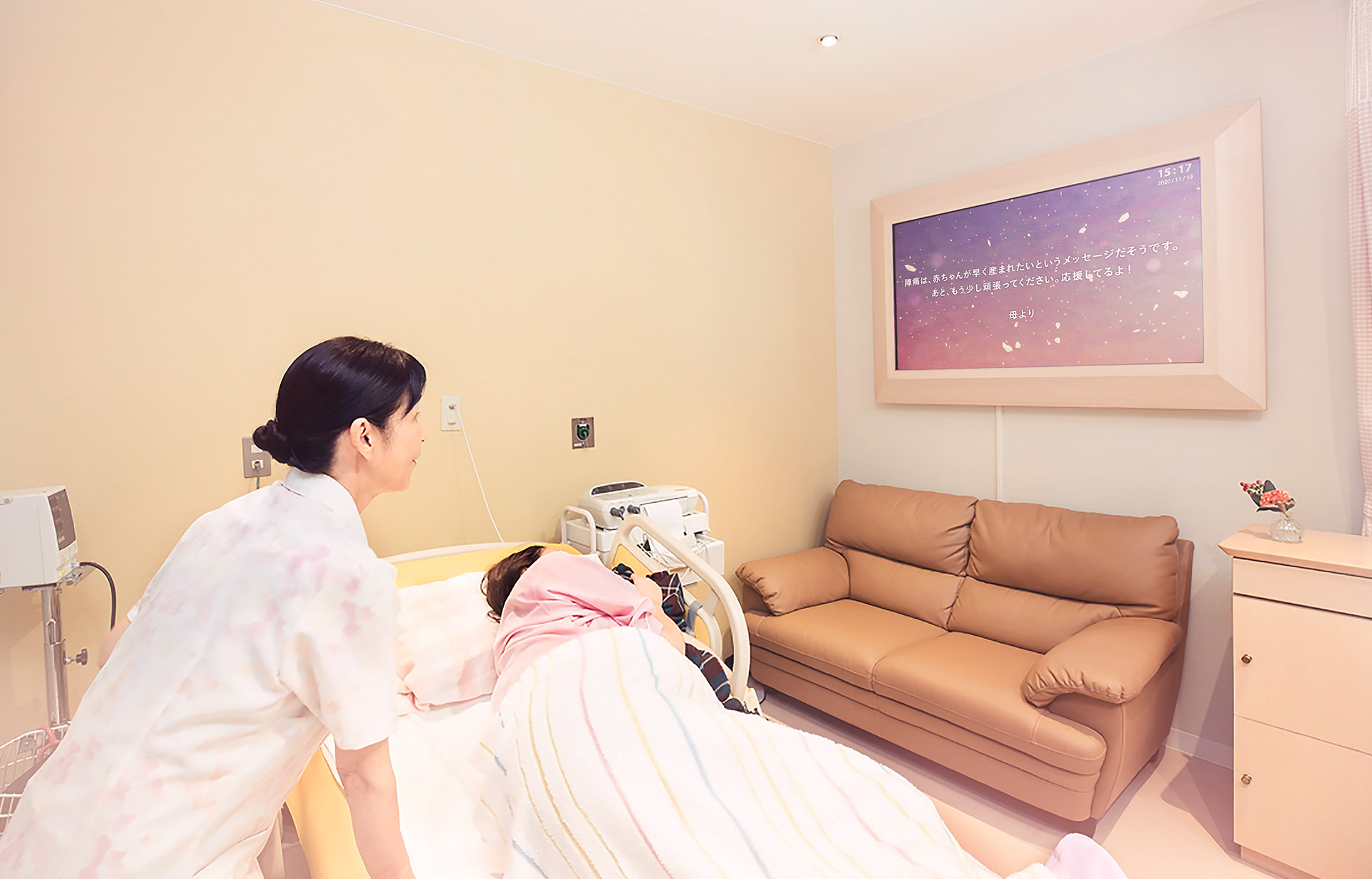 無事に出産できることを願う大切な人たちの存在は、出産当日に妊婦さんが感じる不安や心細い気持ちを支える存在となるはずです。やさしいアニメーションやサウンドとともに、大切な人たちからのメッセージを分娩室にお届けします。